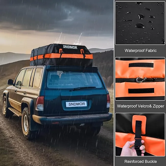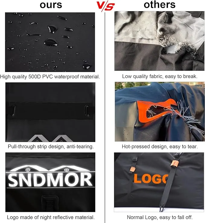 Explorați Geanta pentru Acoperiș SNDMOR, realizată meticulos dintr-un material de înaltă calitate rezistent la apă: 500DPVC, impermeabil și rezistent la uzură. Materialul se remarcă prin proprietăți de înaltă rezistență, dispunând de un fermoar etanș cu dublu sens și un design 100% impermeabil. Clapa cu fermoar acoperit asigură o durabilitate excepțională, rezistând vânturilor puternice, ploilor torențiale sau zăpezii în timpul condusului.