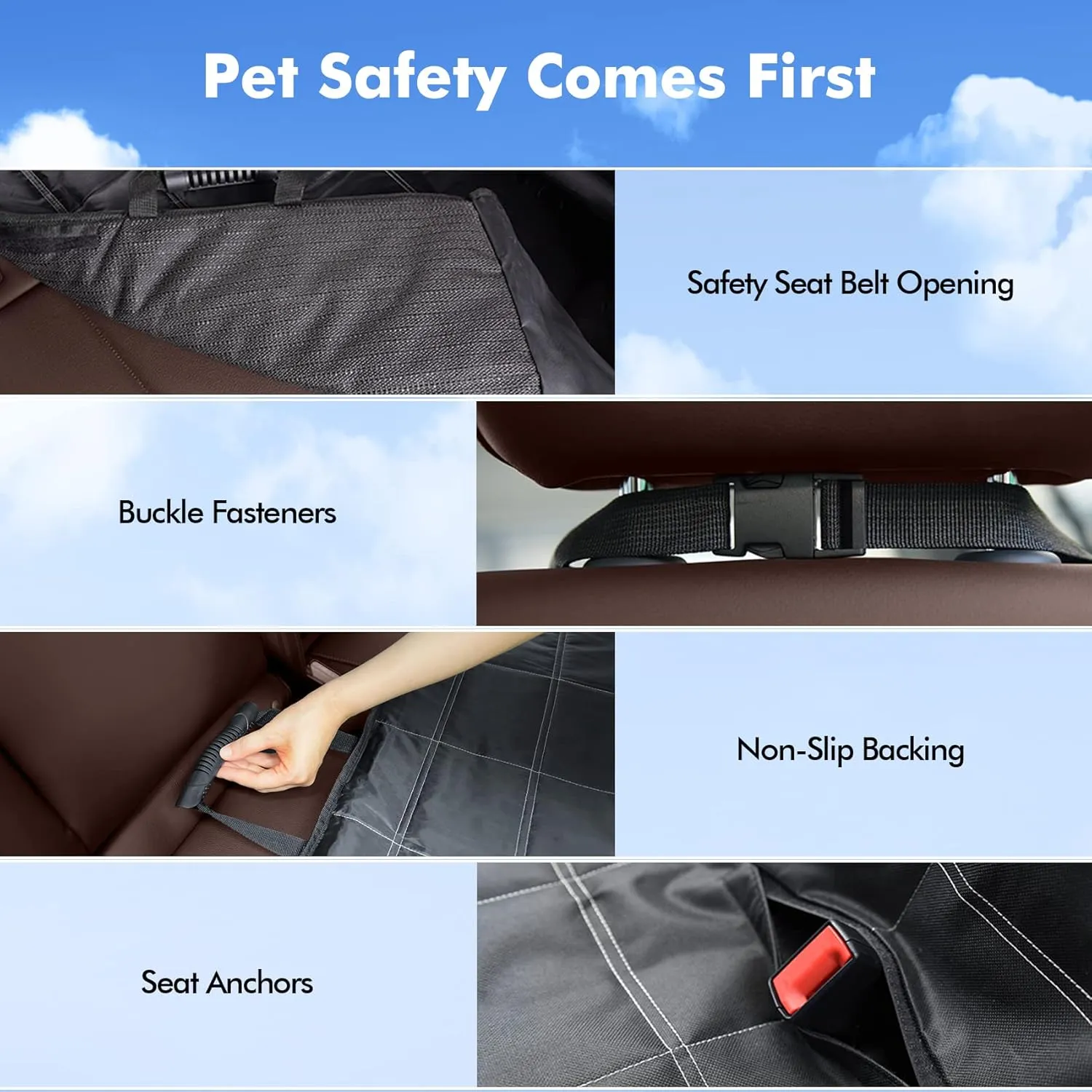 Datorită celor 4 curele de fixare, 2 ancore pentru scaun și bazei anti-alunecare, hamacul rămâne ferm și sigur pe loc. Cele două deschideri integrate permit accesul facil la centurile de siguranță, asigurând protecția și confortul animalului tău în fiecare călătorie.