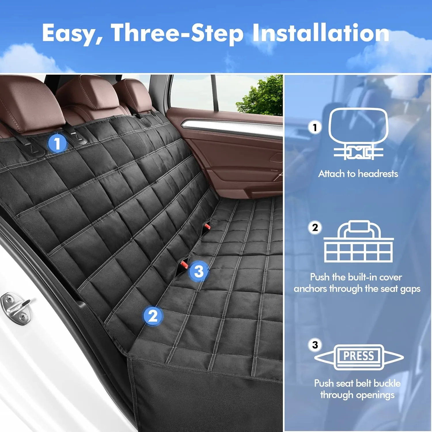 Hamacul poate fi fixat rapid pe bancheta din spate folosind cele 4 curele reglabile pentru tetieră și 2 ancore încorporate pentru prevenirea alunecării. Partea inferioară matlasată este prevăzută cu o plasă anti-alunecare, care asigură o fixare fermă și stabilitate maximă în timpul deplasărilor.