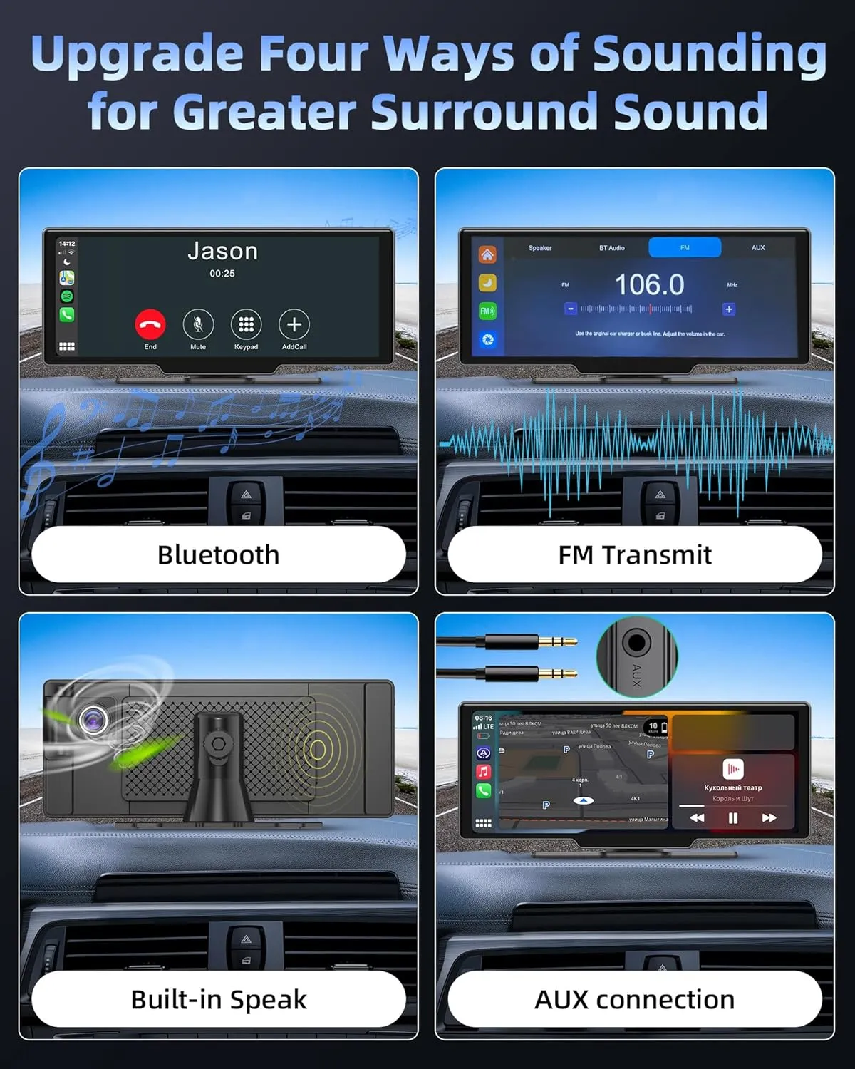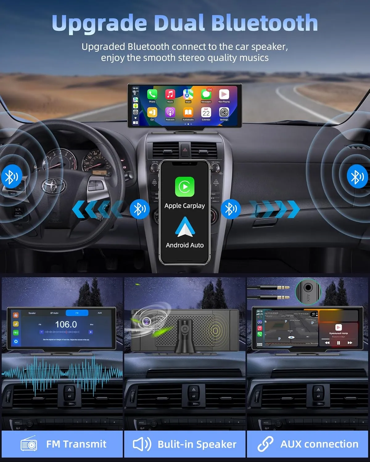 Redă videoclipuri, aplicații sau hărți de pe telefon direct pe ecranul IPS HD 1600×600. Compatibil atât cu iOS cât și Android. - ✅ Bluetooth Dublu + FM/AUX pentru Sunet Clar