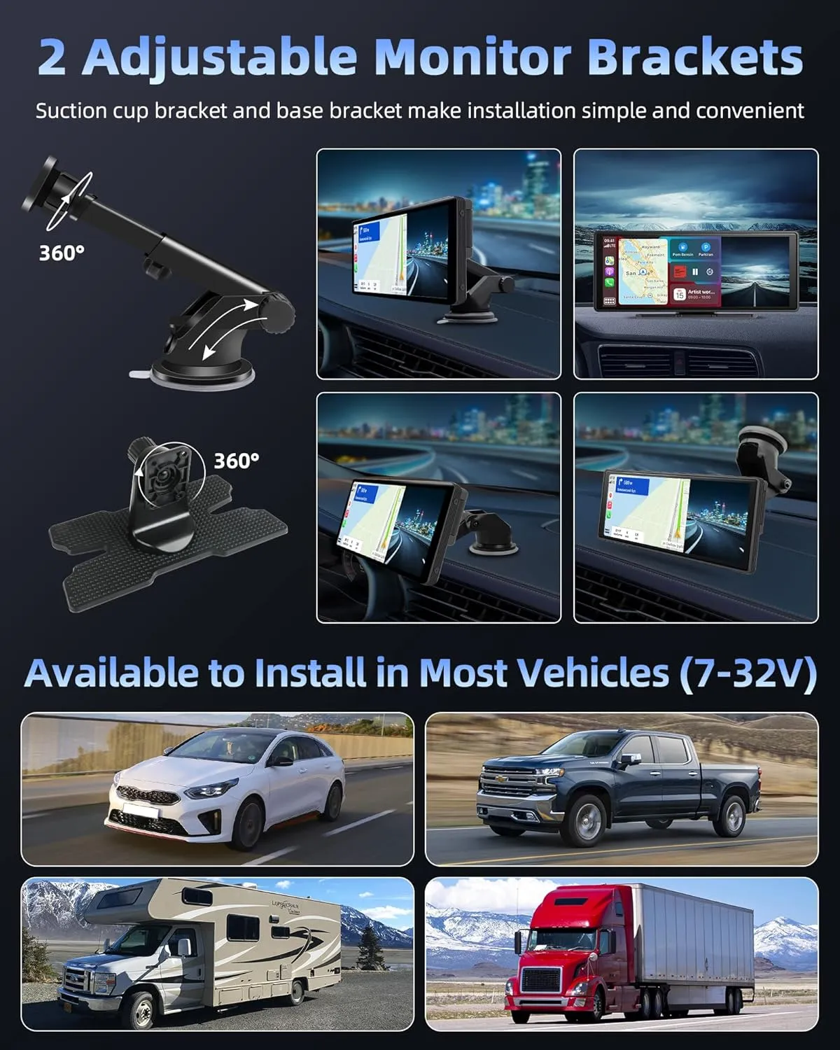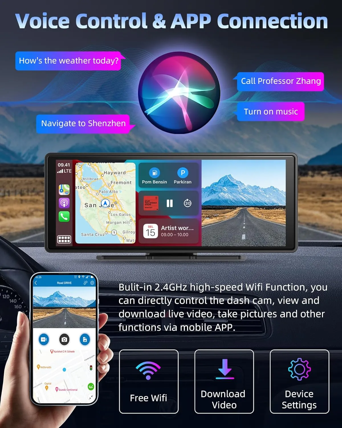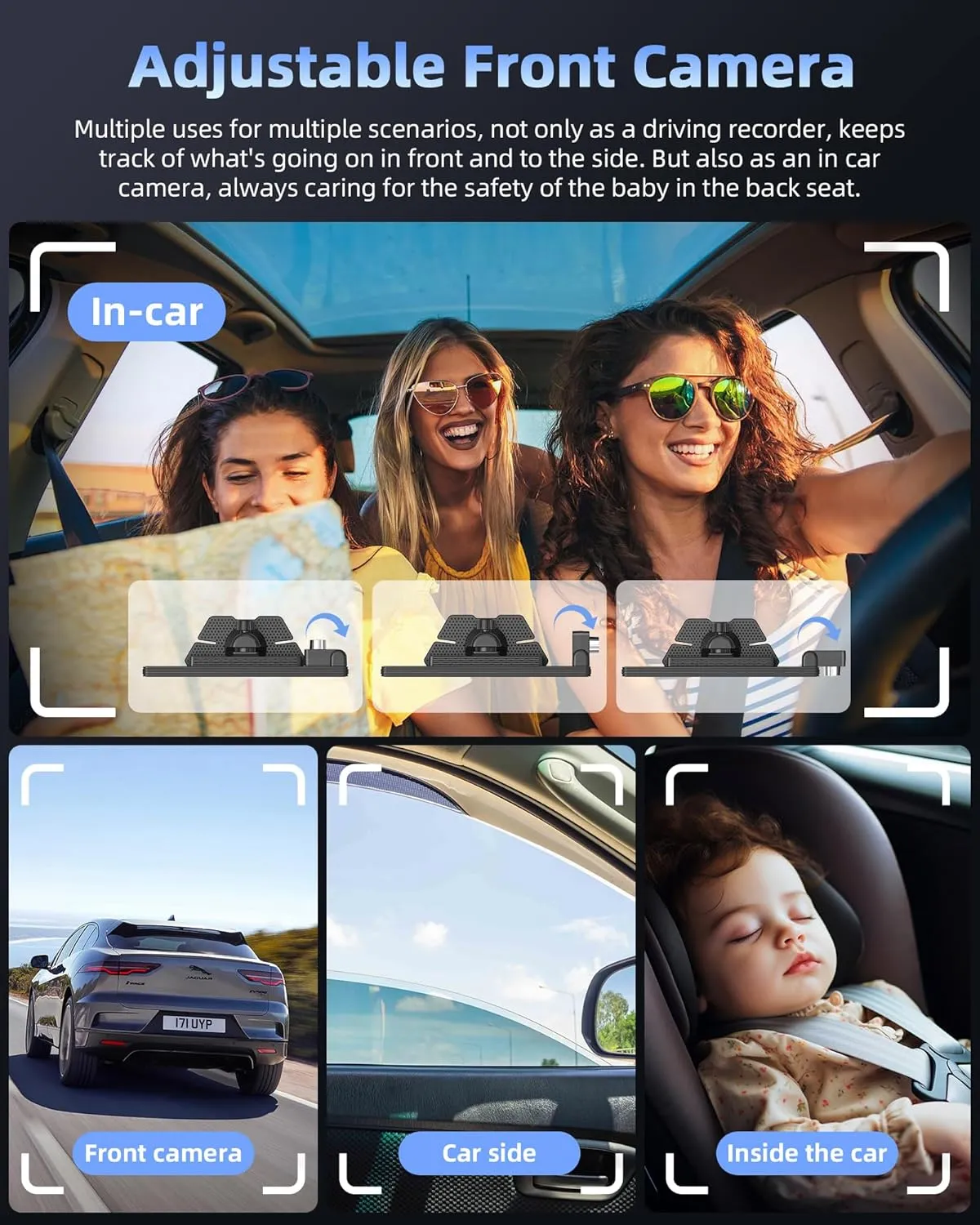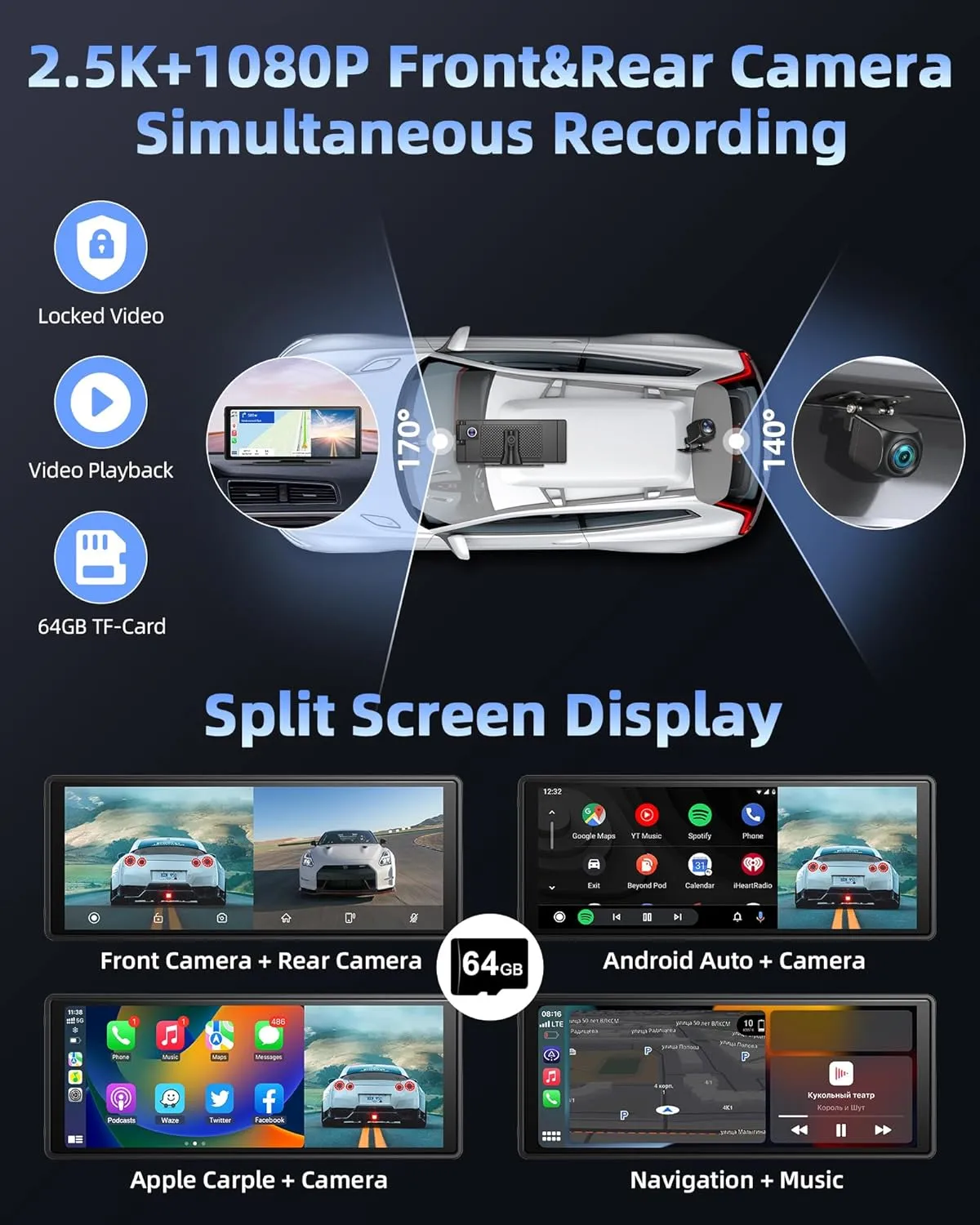Camera frontală rotativă îți permite să filmezi fața drumului, pasagerii sau lateralul – ideal pentru supravegherea copiilor sau monitorizarea parcării. - ✅ Conectivitate Wireless + AirPlay + Android Cast