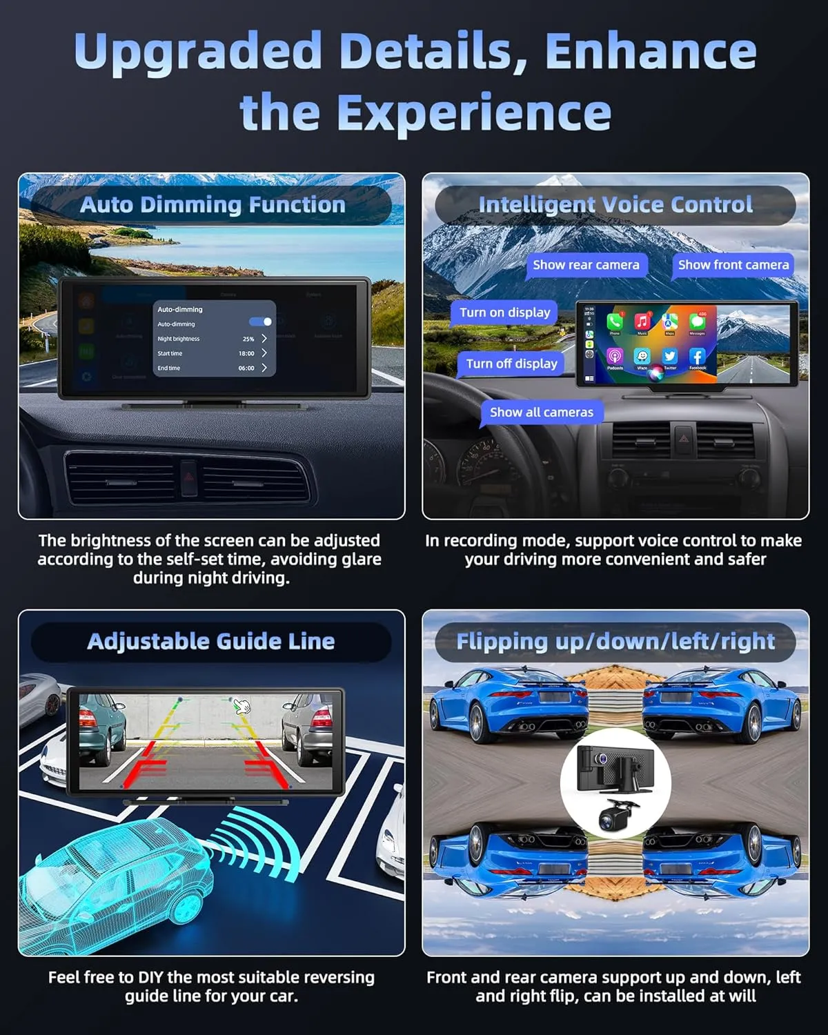 Funcție blackout automată anti-orbire, control vocal pentru dashcam, linii ghidaj ajustabile și funcție de oglindire imagine pentru mers înapoi. - ✅ Instalare Plug & Play – Compatibil 7V–36V