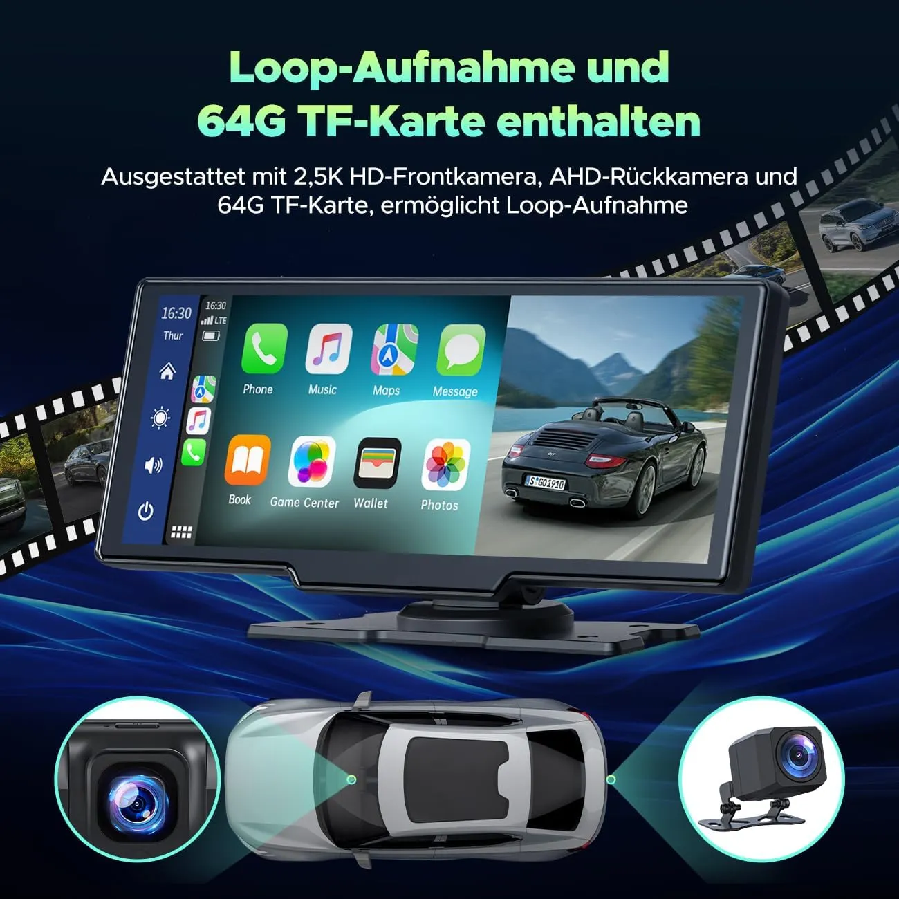 Înregistrează zi și noapte, cu funcție de vizualizare simultană split-screen pentru mers înapoi și siguranță la condus. Include card TF de 64GB. - ✅ Funcție Mirror Link AirPlay & Android Cast
