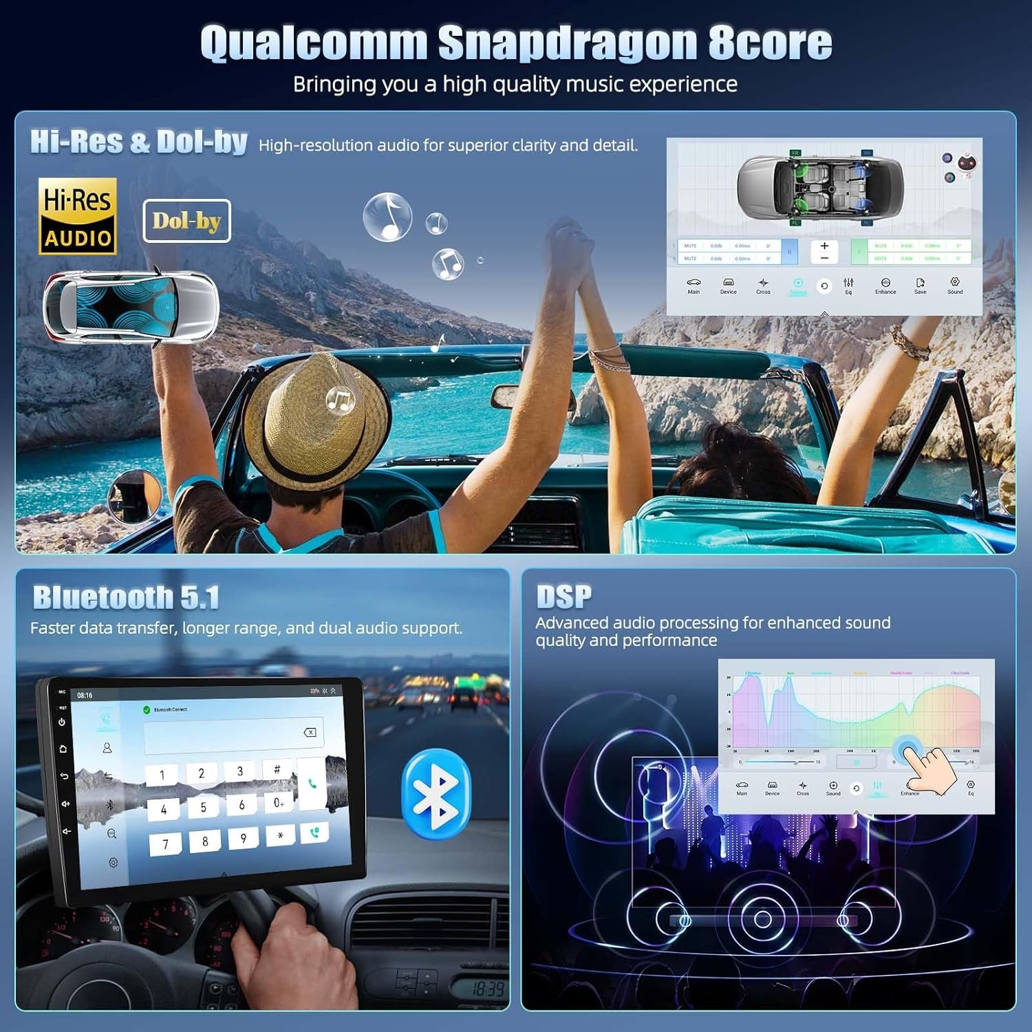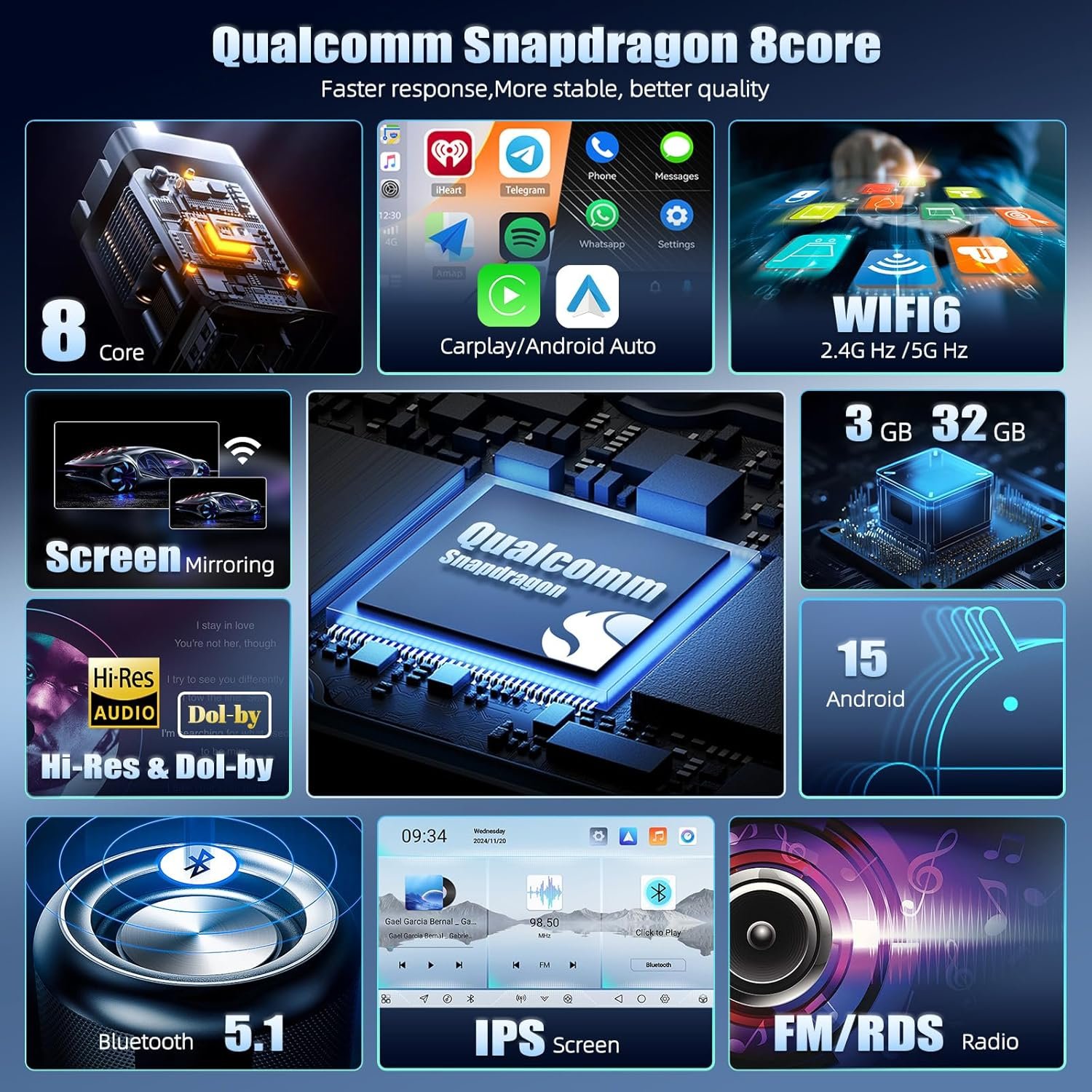 Radio-ul auto 2-DIN cu Android 15.0 oferă o interfață modernizată, timp de răspuns mai rapid și funcții îmbunătățite față de Android 13. Procesorul Qualcomm cu 8 nuclee (4 performante + 4 eficiente energetic) oferă o putere de procesare cu 40% mai mare. Navigația precisă, comenzi vocale, redare pe ecrane multiple – toate rulează fluent, oferind o experiență mai plăcută și confortabilă.