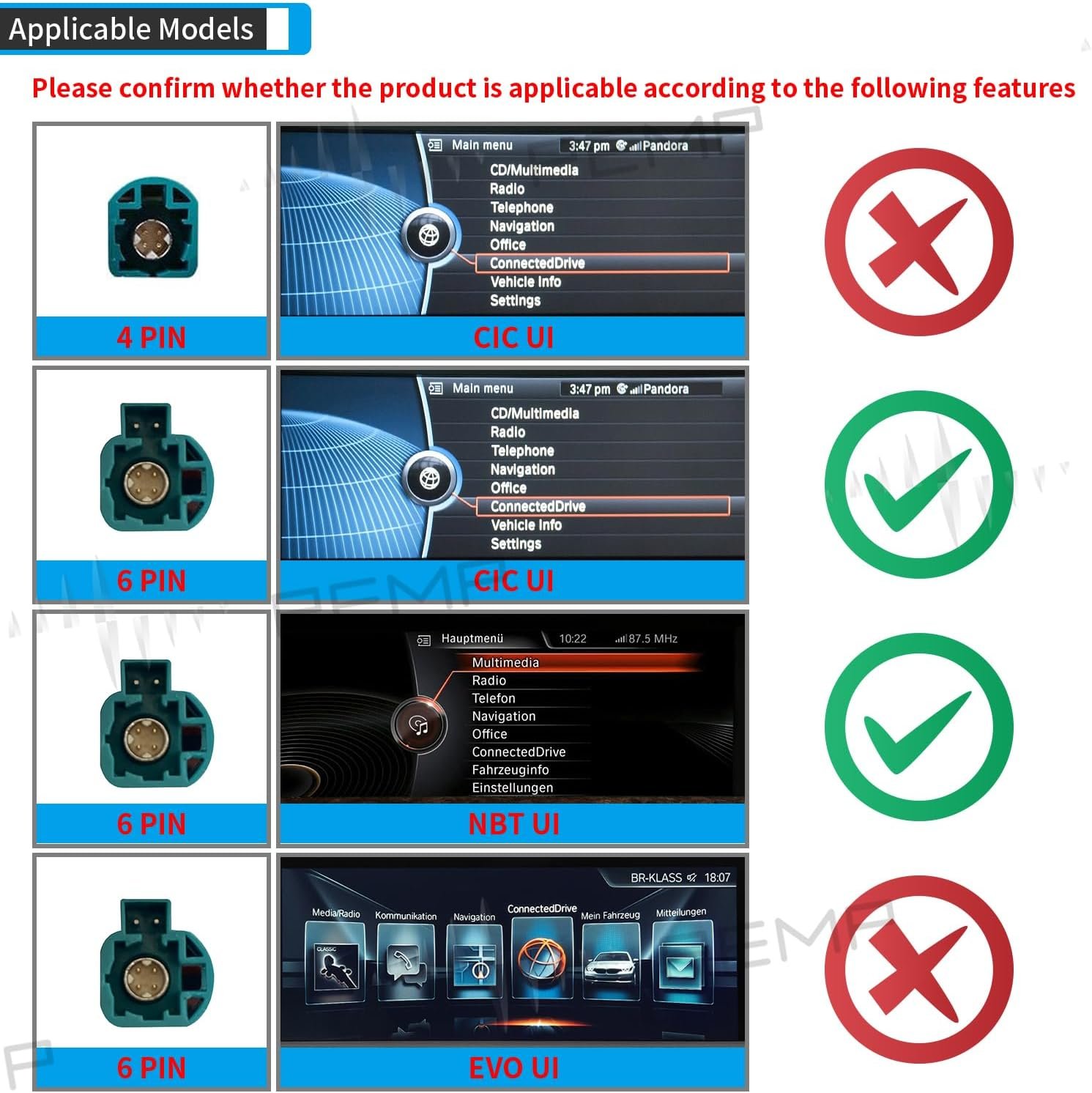 - Compatibil doar cu sistemul NBT. Pe spatele ecranului original trebuie să fie un conector LVDS 6PIN.