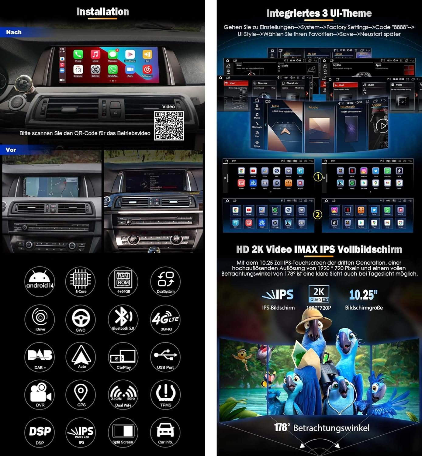 Radio auto cu GPS de 10.25 inch, Bluetooth și Android 14 pentru BMW Seria 5 F10/F11 cu sistem NBT. Menține funcțiile originale ale mașinii: radio, sistem iDrive și amplificator. Suportă intrare și afișare OEM radio/CD fără a modifica cablajul original. Ecran IPS lat cu rezoluție ultra HD 1920×720. Procesor Qualcomm Snapdragon 665, tehnologie 11nm, CPU 8-core.