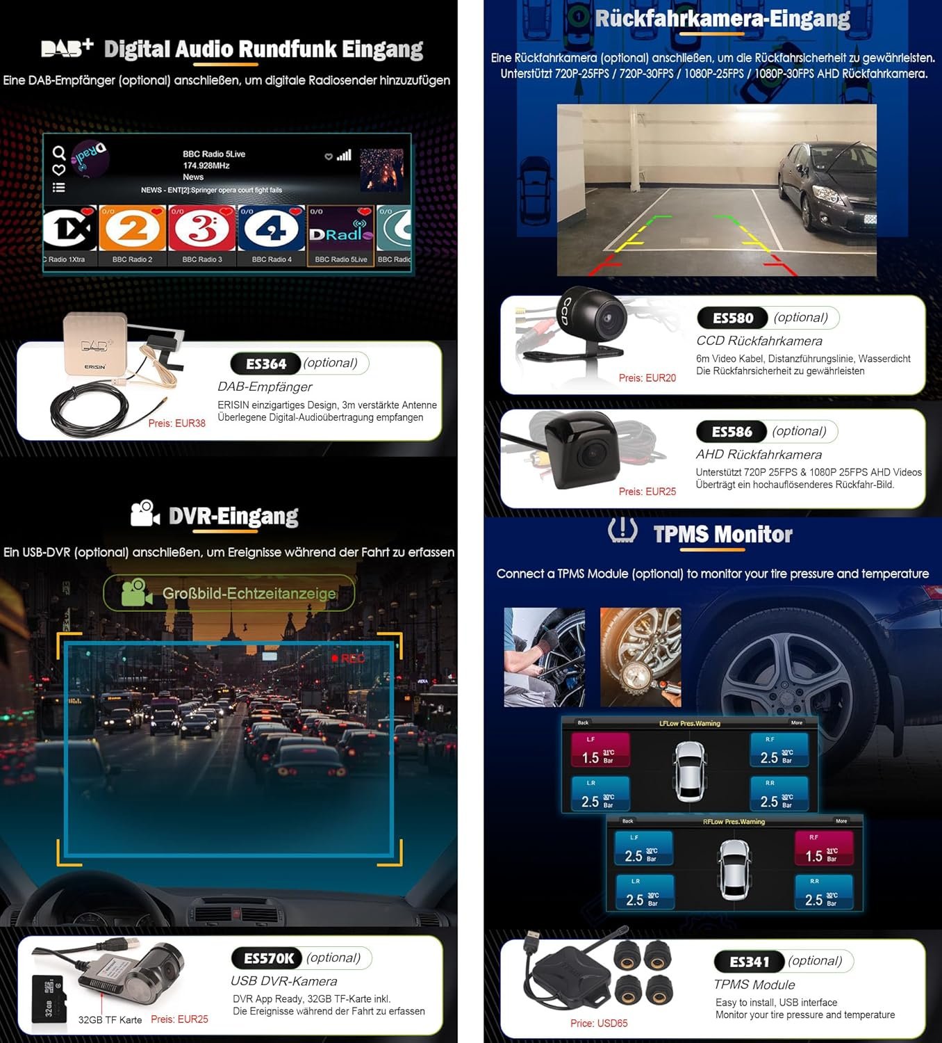 - Suportă DAB, TPMS, DVR etc. prin USB