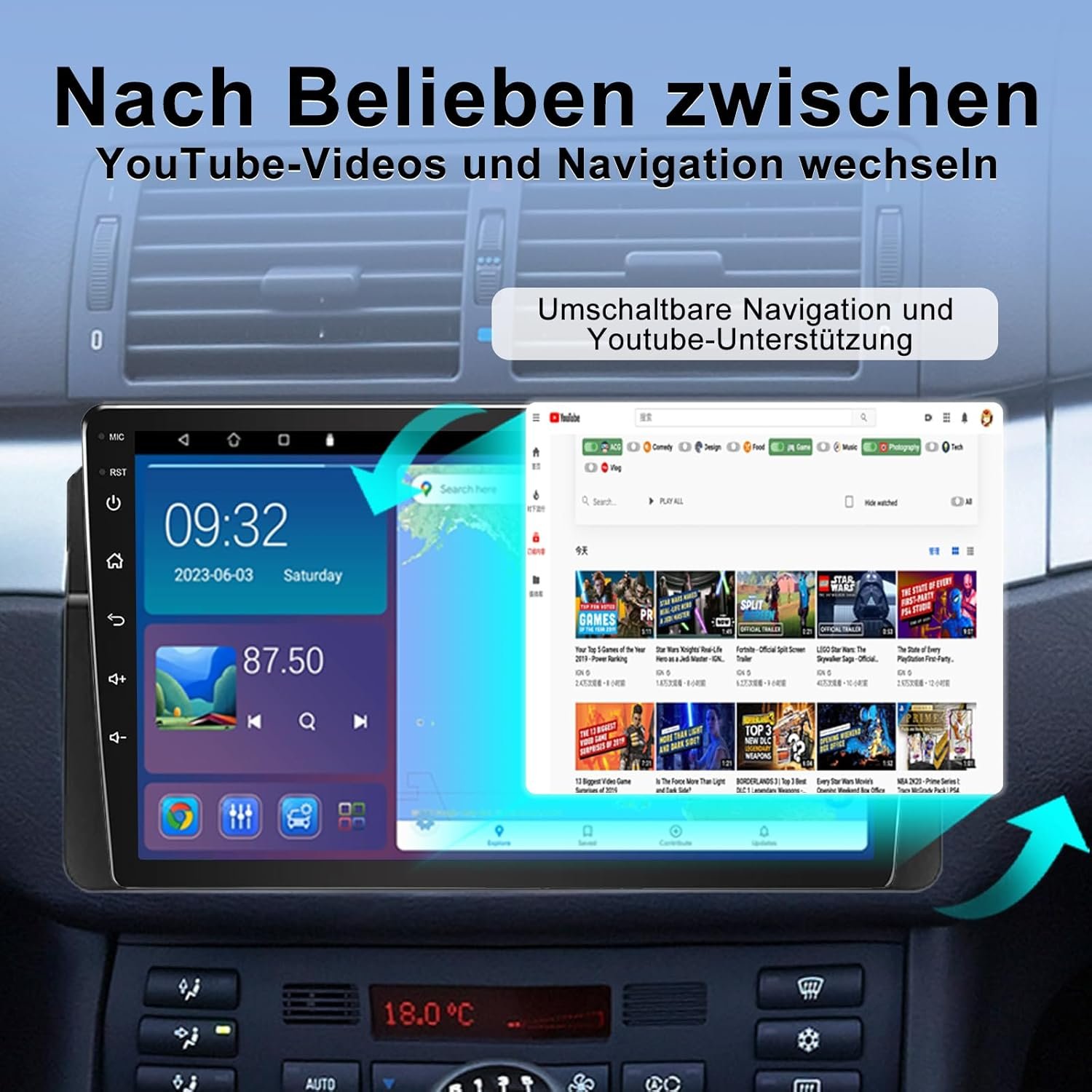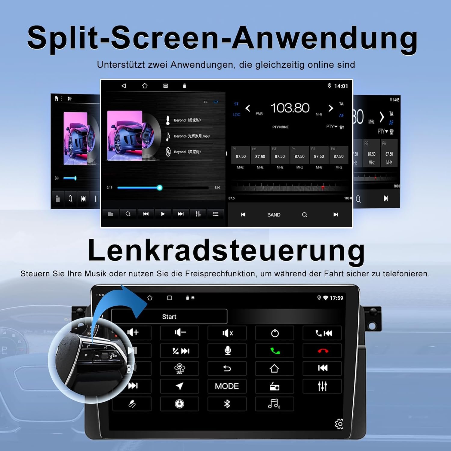Echipat cu procesor quad-core real, 4 GB RAM și 64 GB stocare, pentru operare fluidă și rapidă. Include WiFi și Bluetooth integrate și suportă comenzile de pe volan.