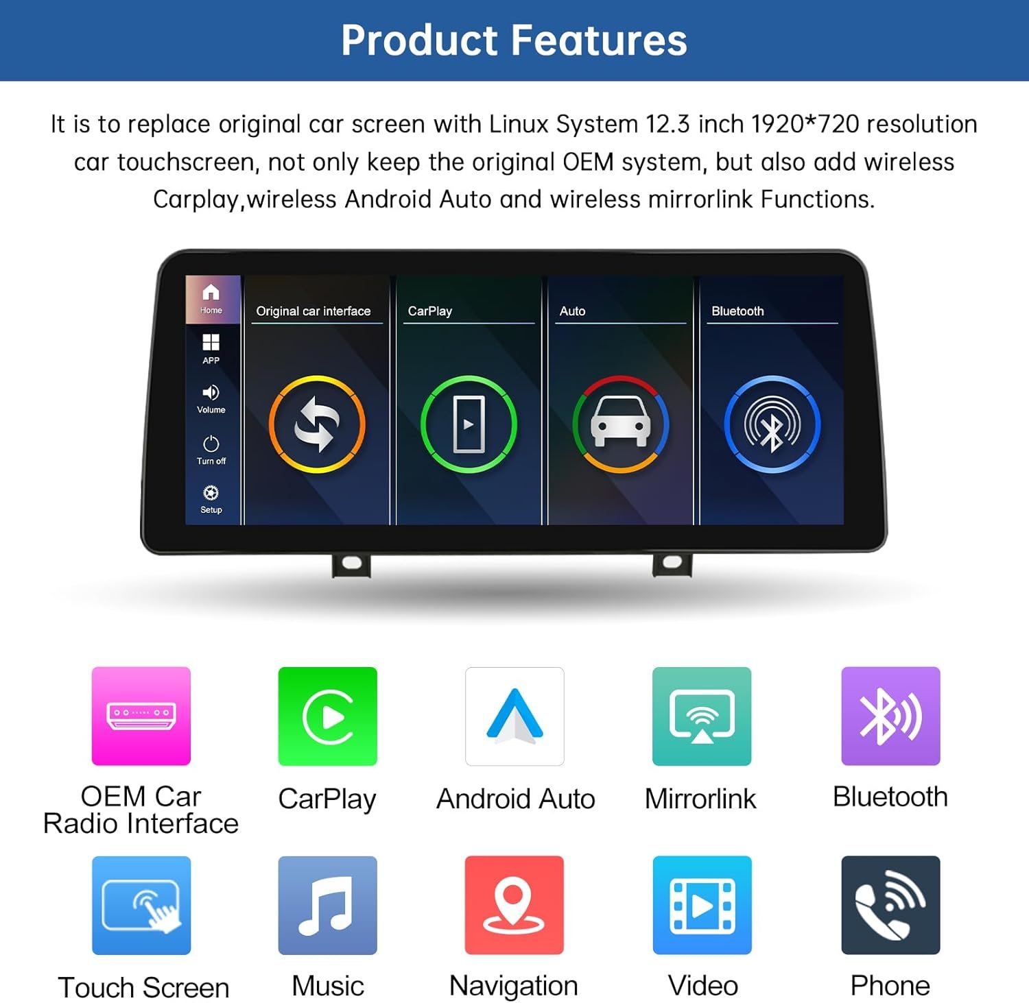- Prezentare generală: Înlocuiește ecranul original cu un ecran tactil de 12,3 inch cu sistem Linux. Menține sistemul OEM original și adaugă funcții precum CarPlay wireless, Android Auto wireless și MirrorLink wireless. Ecranul HD 1920 x 720 oferă o imagine clară și vibrantă.