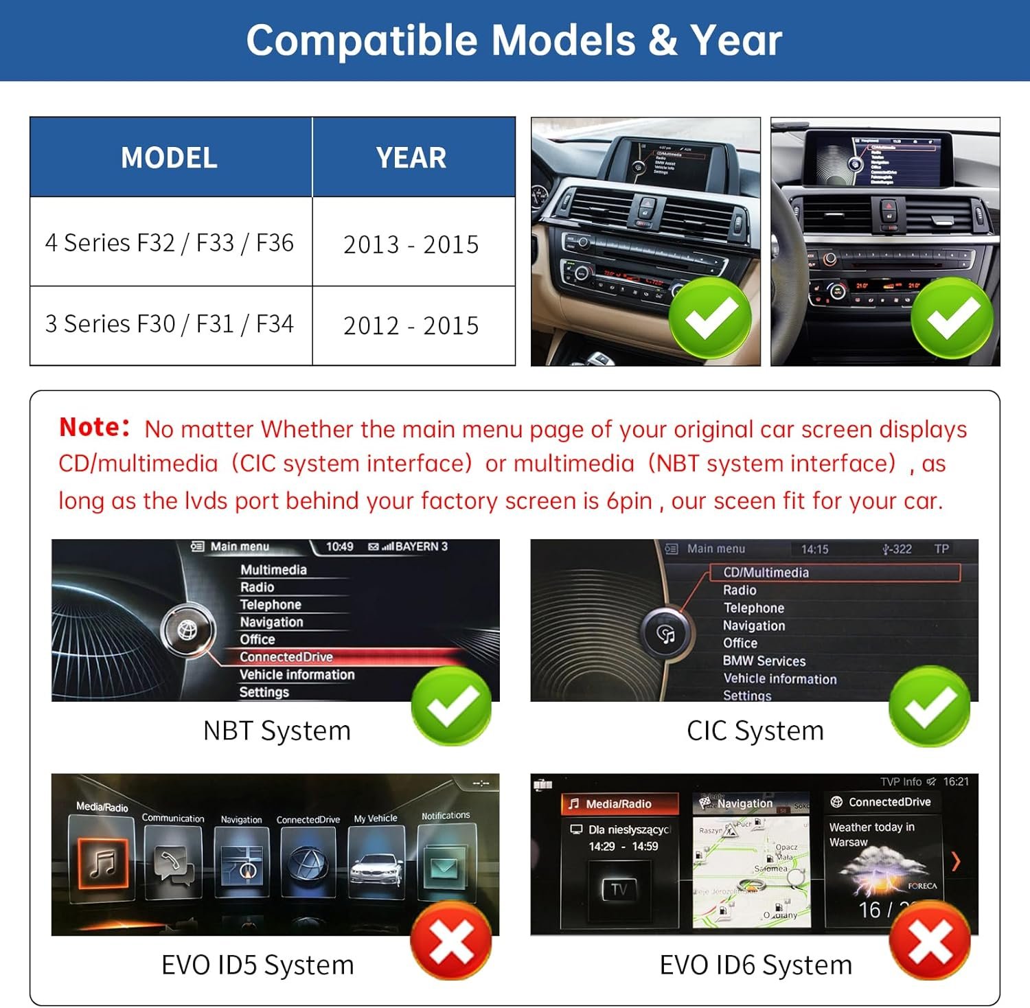 - Vehicule compatibile: Potrivit pentru BMW Seria 3 și Seria 4 F30/F31/F32/F33/F34/F36 din anii 2012–2015. Indiferent dacă interfața sistemului original este CIC (CD/Multimedia) sau NBT (Multimedia), atâta timp cât portul LVDS de pe spatele ecranului este de tip 6 pini, acest ecran este compatibil.