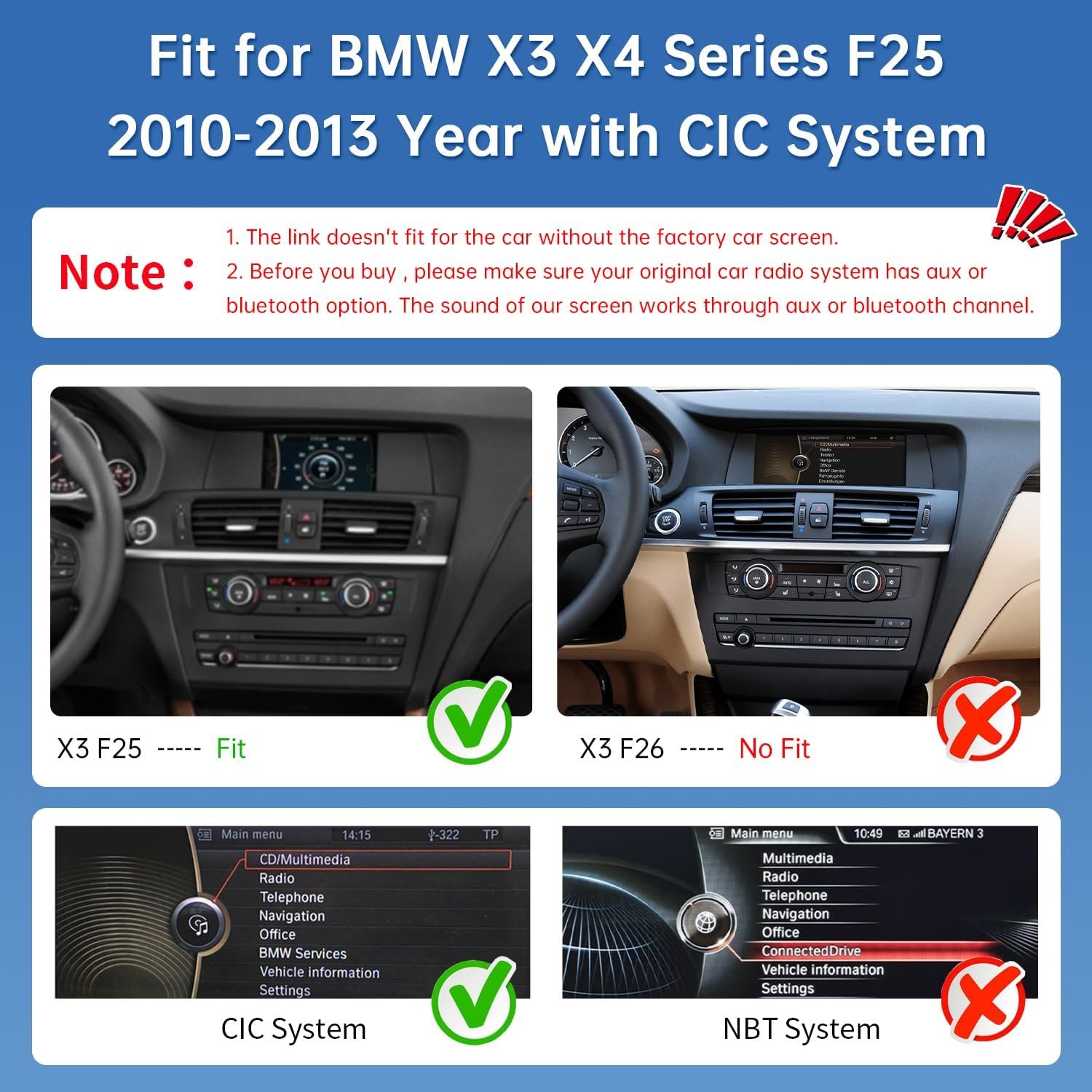 Ecranul CarPlay este compatibil cu BMW X3/X4 Seria F25/F26, anii 2013–2016, cu sistem CIC. Înainte de achiziție, asigurați-vă că radioul original al mașinii are opțiune AUX sau Bluetooth, deoarece sunetul este transmis prin Aux sau Bluetooth. Nu este compatibil cu mașinile fără ecran original de fabrică. Nu comandați dacă mașina dumneavoastră nu are un ecran original.