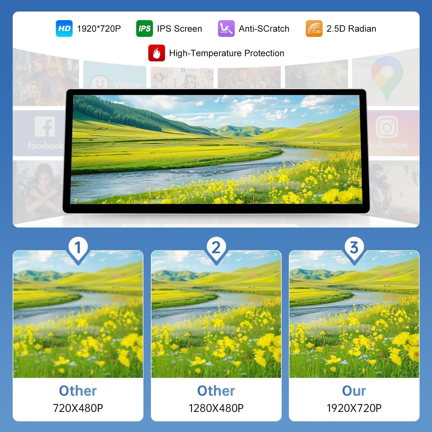 Ecran HD de 12,3 inci cu rezoluție înaltă 1920×720. Carcasa este complet din aluminiu, cu o ramă îngustă. Rezoluție excelentă, culori vibrante și unghiuri largi de vizualizare oferite de panoul IPS. Acest ecran actualizează unitatea originală la un display mai mare, perfect compatibil cu sistemul original al mașinii, oferind o experiență vizuală superioară.