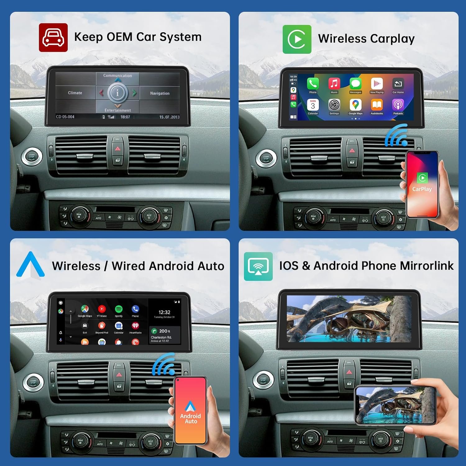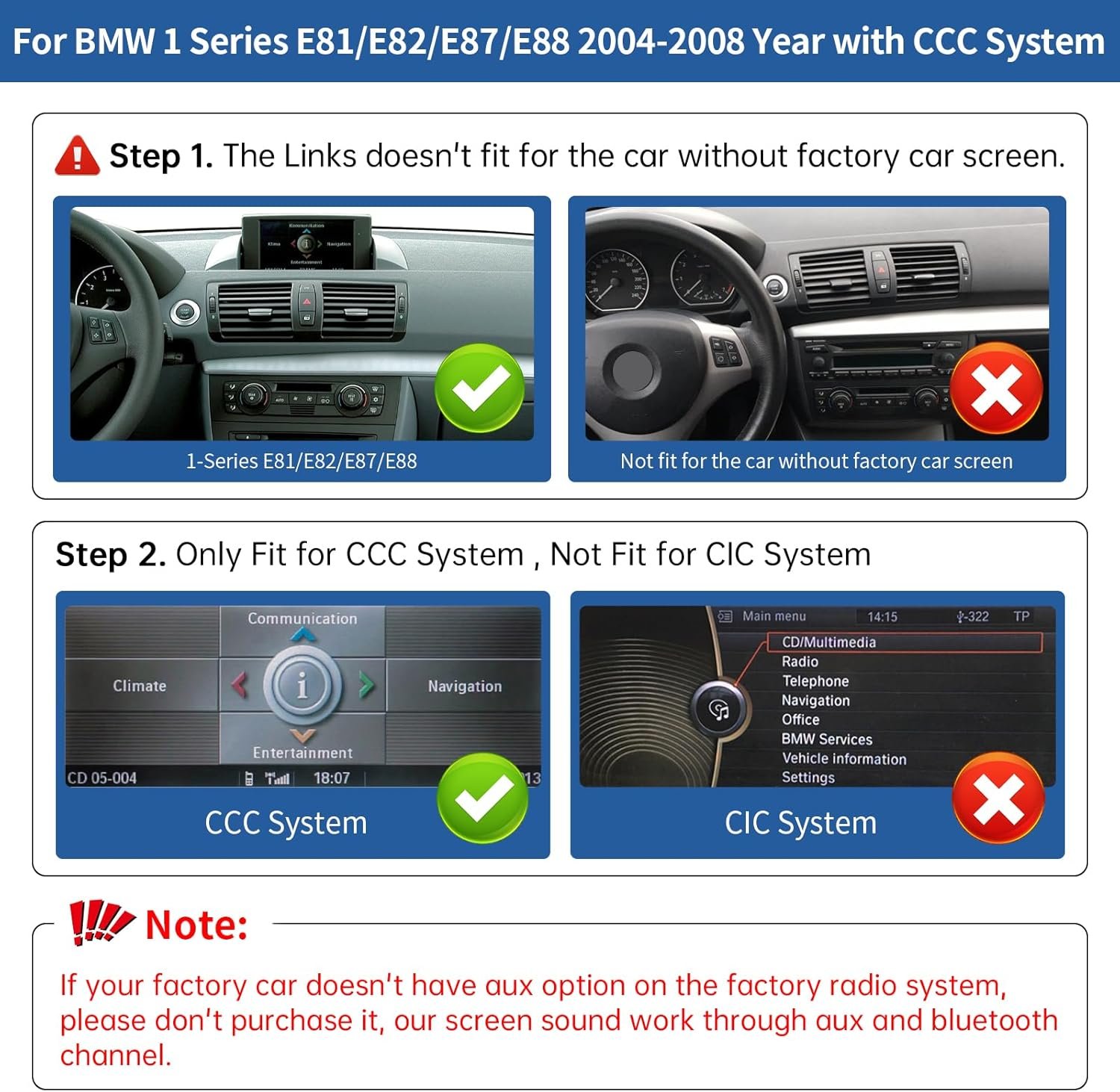 Receptor radio auto de 10.25 inch pentru BMW Seria 1 E81/E82/E87/E88 din anii 2004–2008 cu sistem CCC. Nu este compatibil cu mașinile fără ecran original din fabrică! De asemenea, nu este compatibil cu mașinile fără AUX, deoarece sunetul funcției touchscreen trece prin canalul AUX.