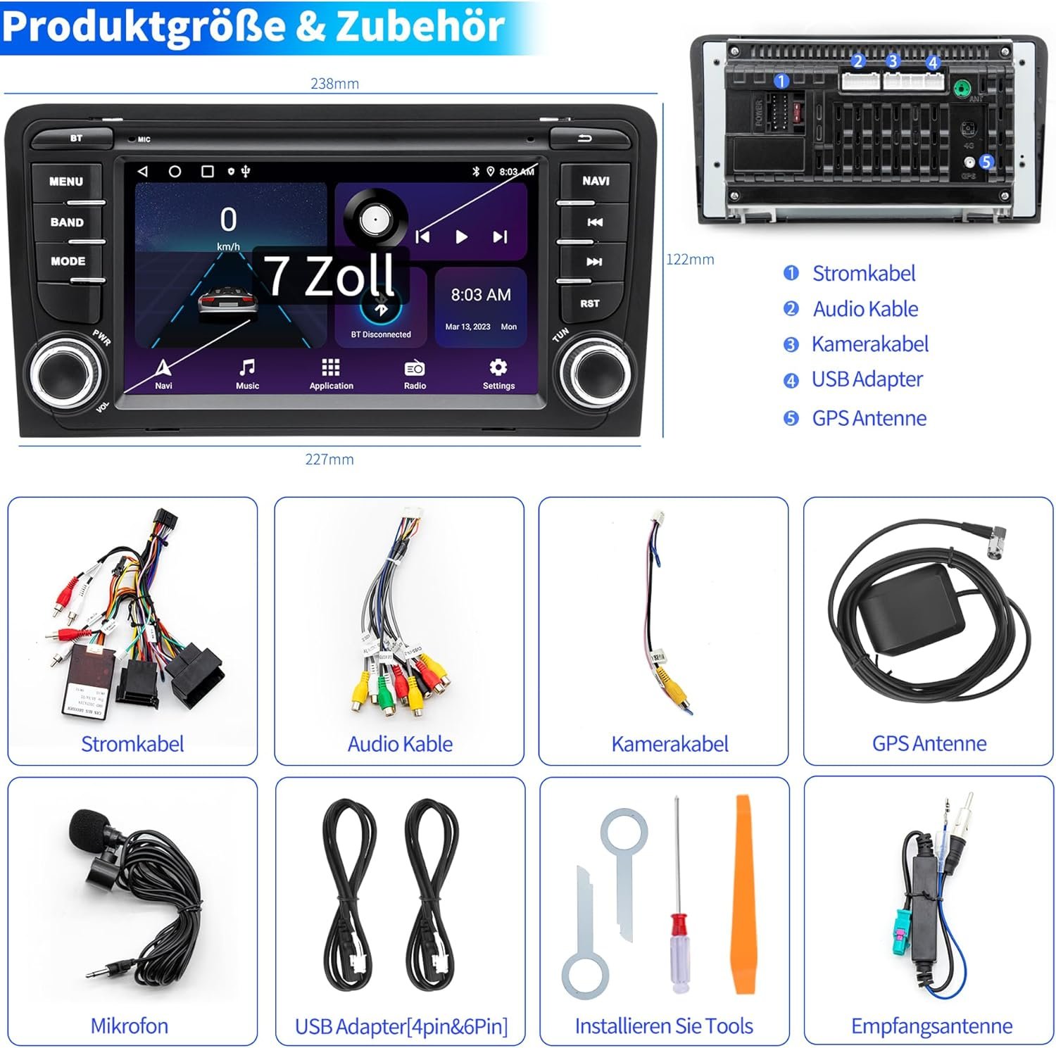 Radio auto pentru Audi A3 S3 8P RS3 2003-2012, Sistem Android 12 2G+64G cu CarPlay Android Auto, Ecran Tactil de 7 Inch, Suportă Navigație GPS, WLAN, Bluetooth, FM