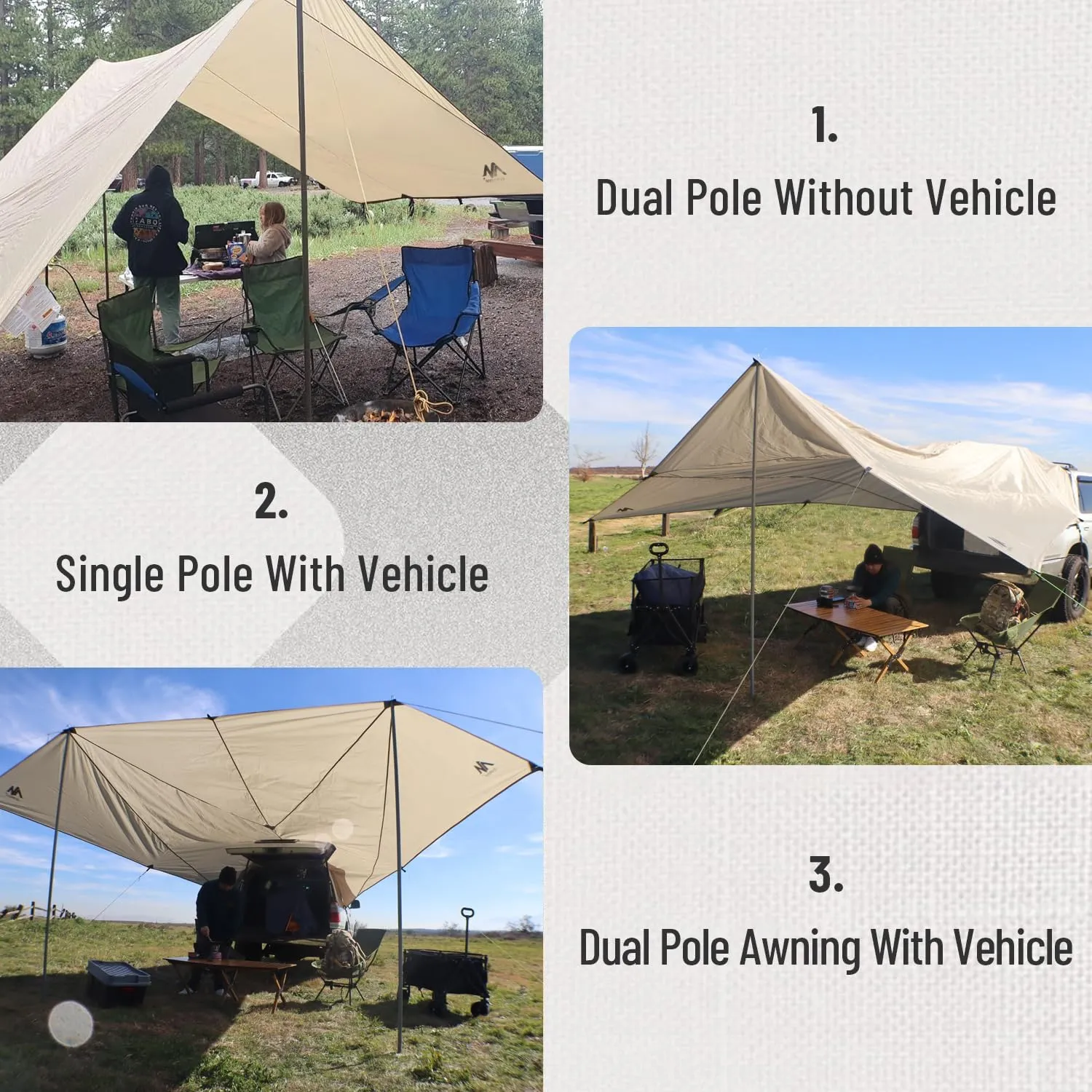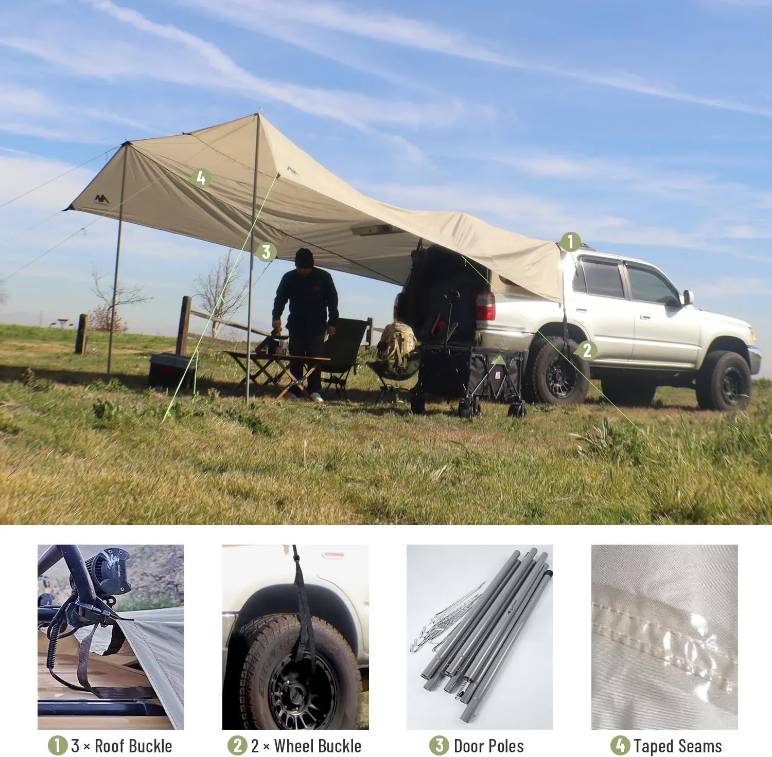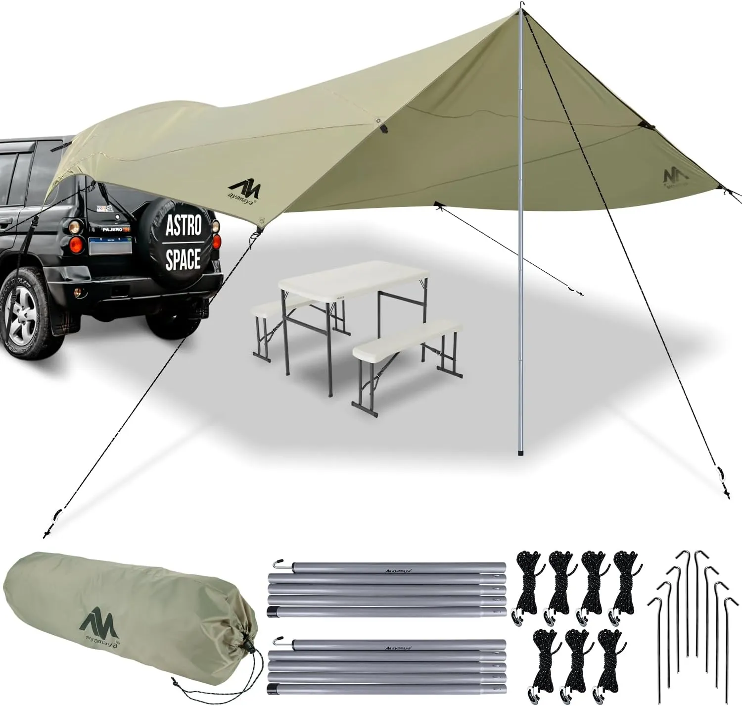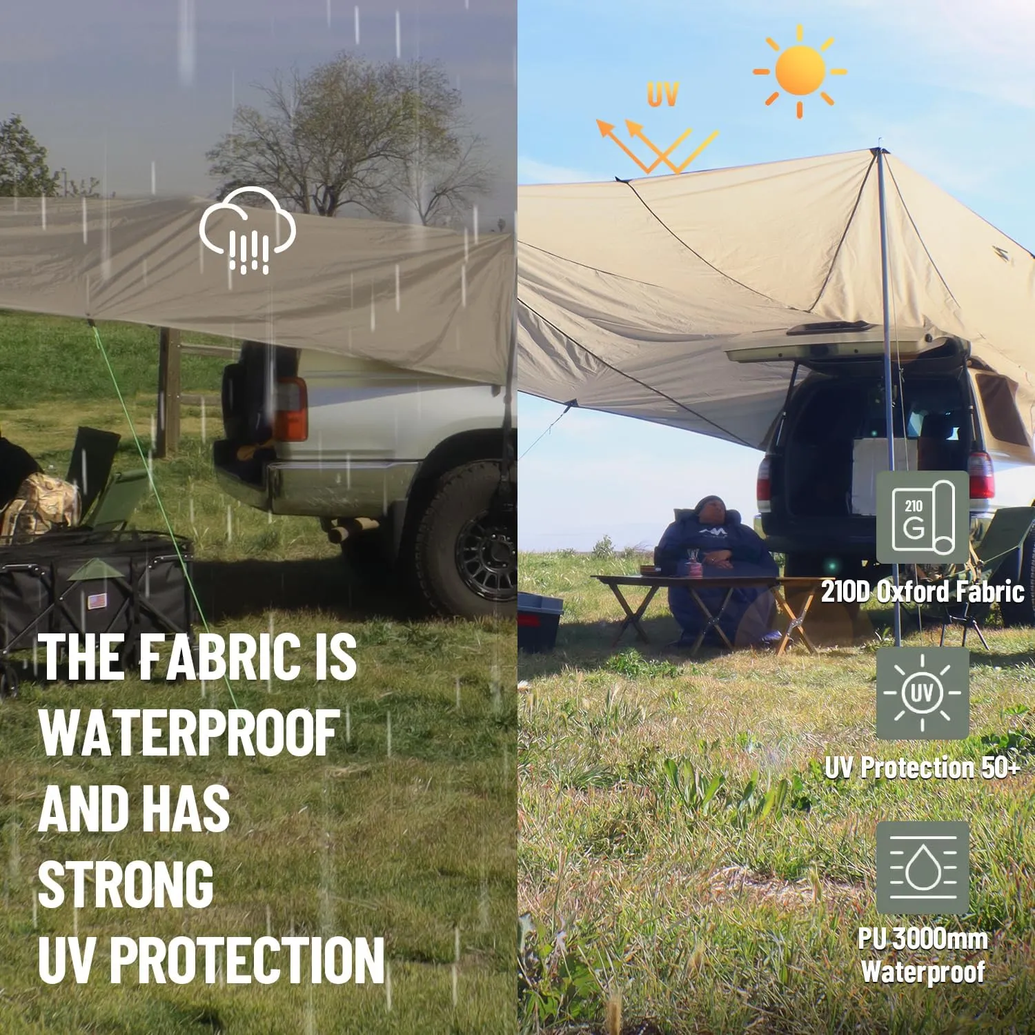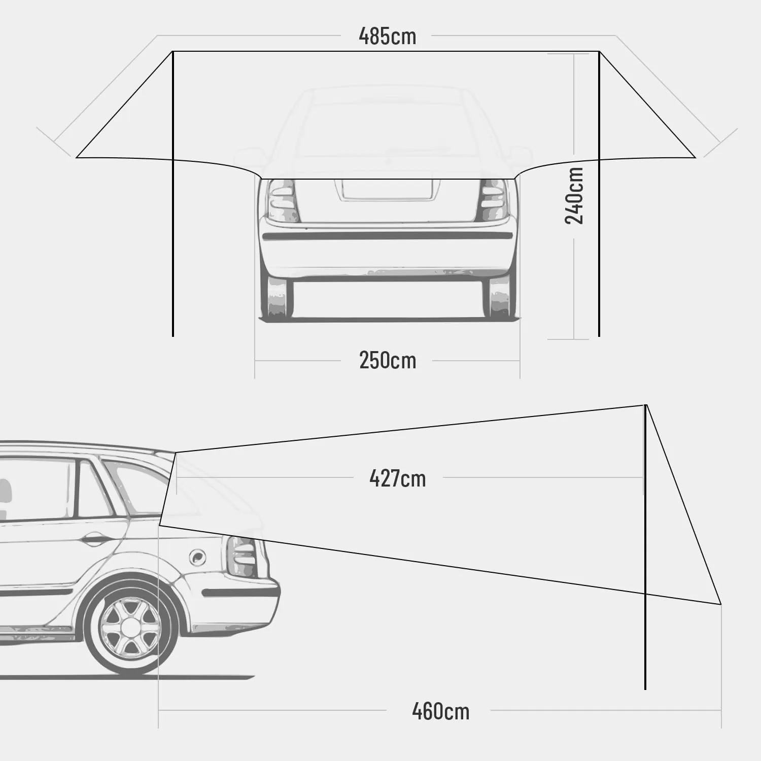 Această copertină extensibilă pentru mașină este soluția ideală pentru cei care își doresc un spațiu generos de umbră atunci când campează, iau masa în aer liber sau organizează o pauză confortabilă pe drum. Se montează ușor din zona hayonului și oferă o zonă de protecție de peste 20 m², perfectă pentru o masă cu scaune în spatele vehiculului.