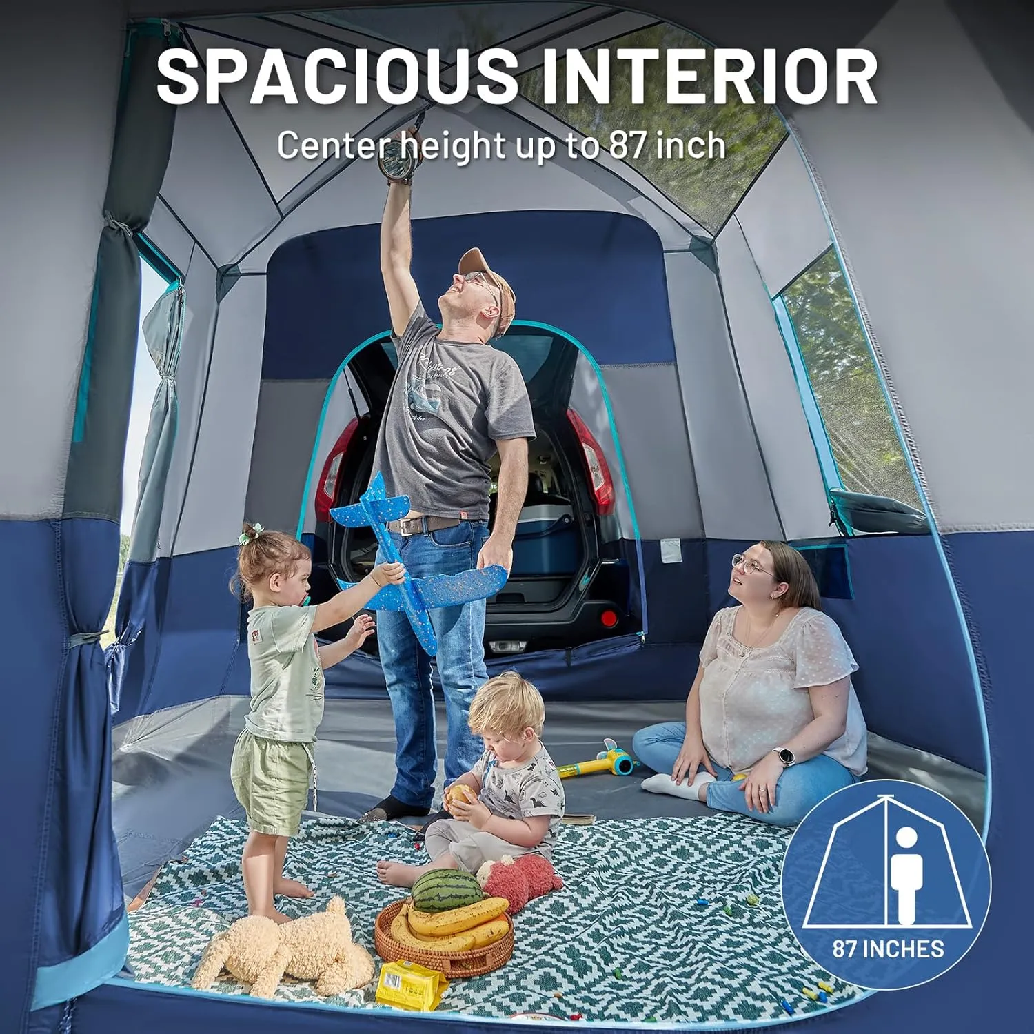 - Copertină integrată și verandă cu plasă – zona frontală adaugă spațiu suplimentar protejat, perfect pentru scaune, genți frigorifice sau încălțăminte;