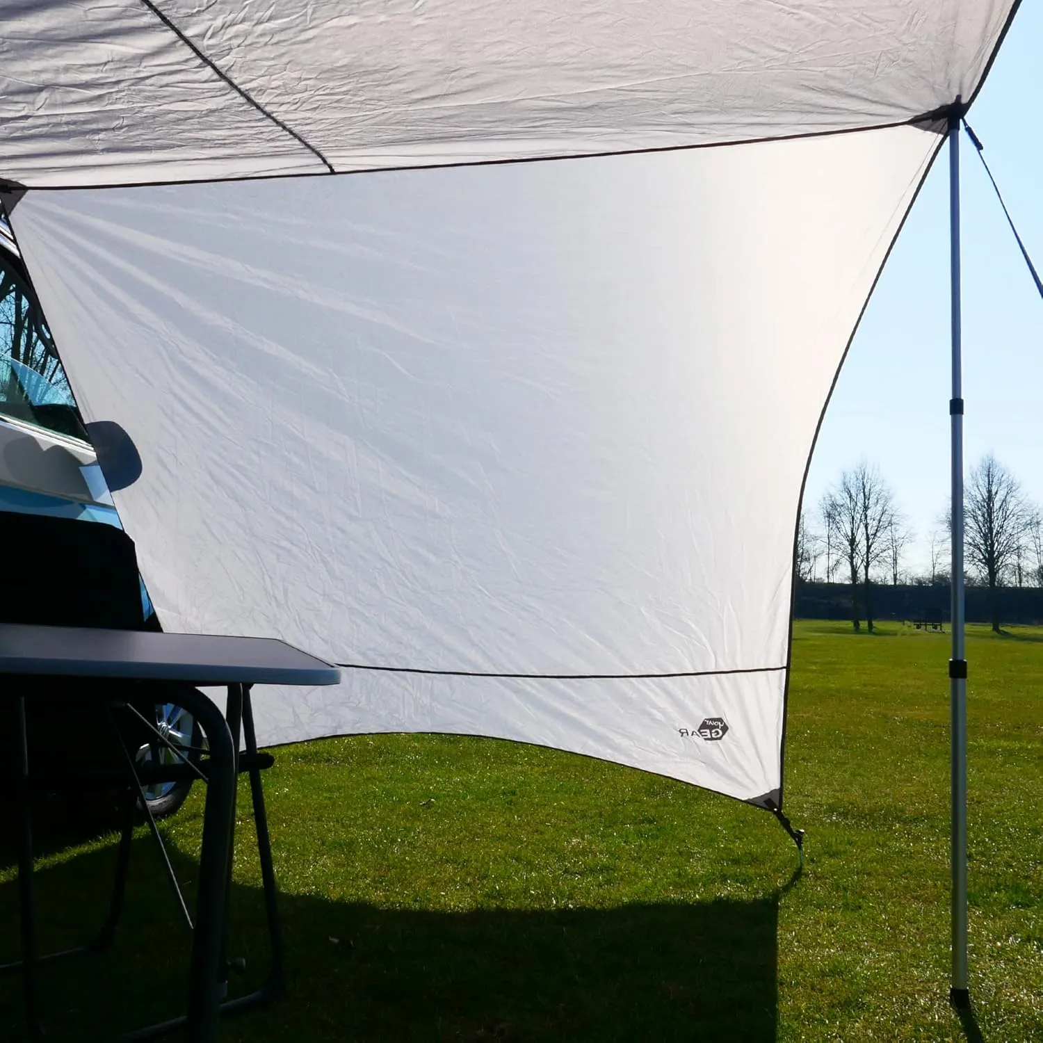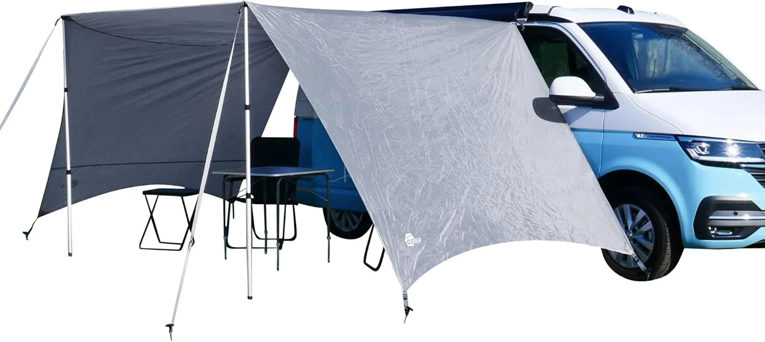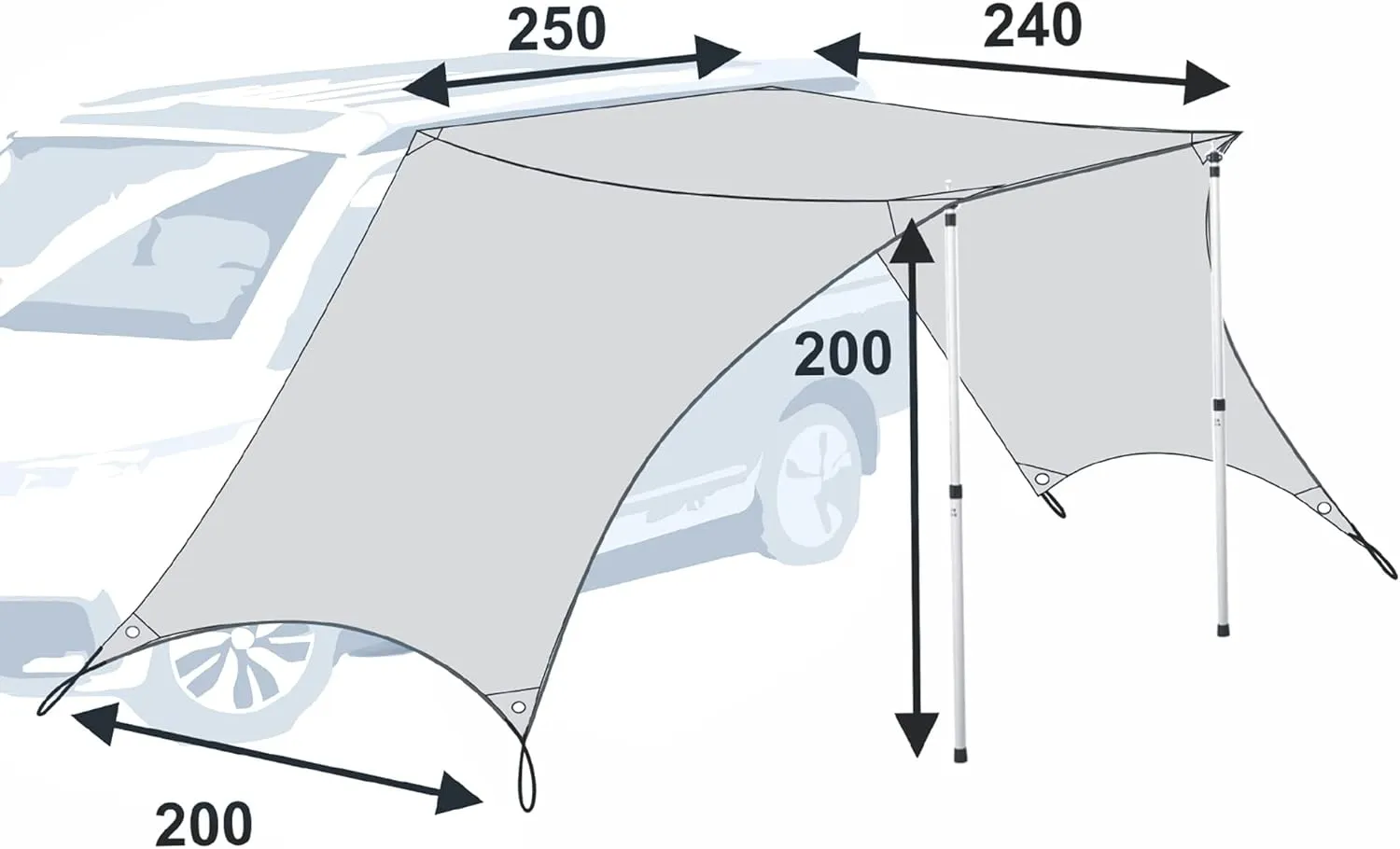 Copertină auto pentru autorulotă 260x240 cm, montată pe dubă, cu bețe telescopice și protecție UV 50+ împotriva soarelui și ploii.